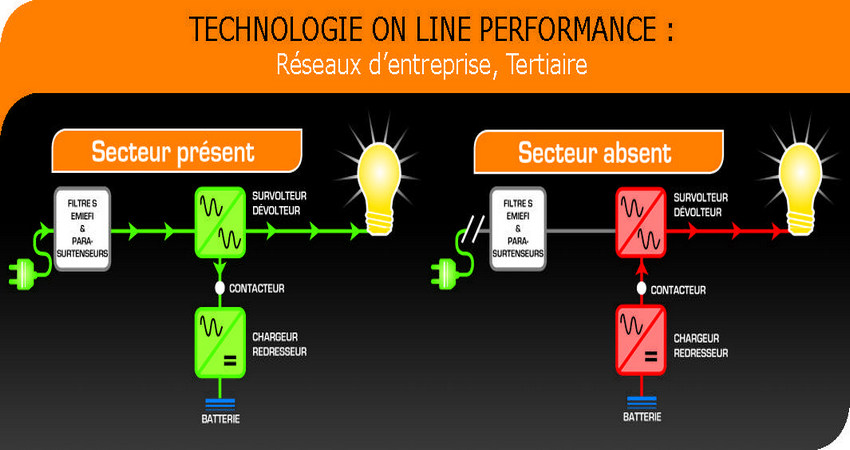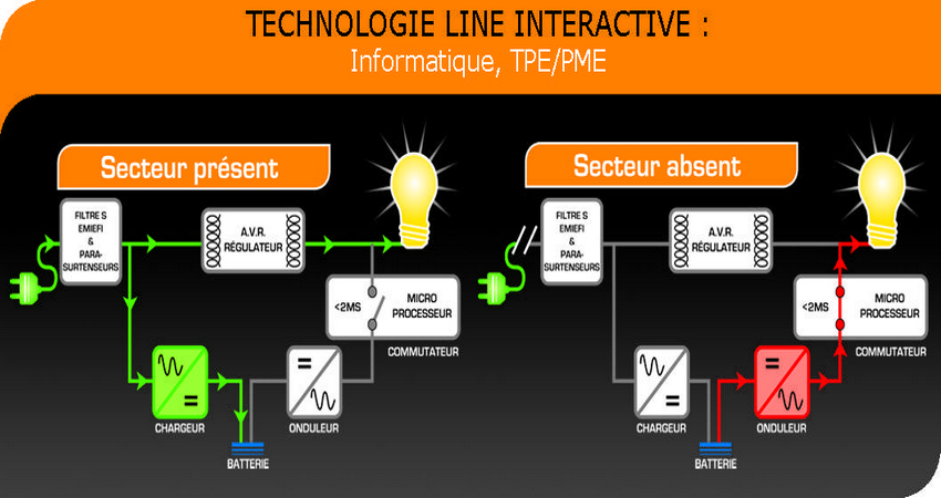 L’onduleur « lisse » la tension électrique, en supprimant les crêtes dépassant un certain seuil. En cas de coupure de courant, l’énergie emmagasinée dans la batterie de secours maintient l’alimentation des matériels pendant un temps donné, selon la puissance de l’onduleur et le nombre d’équipements maintenus en fonctionnement. Cela permet d’éteindre proprement les systèmes informatiques en cas de coupure prolongée. Certains onduleurs peuvent également être interfacés avec l’ordinateur ou le serveur (USB, série, IP) et leur éviter ainsi les coupures brutales.